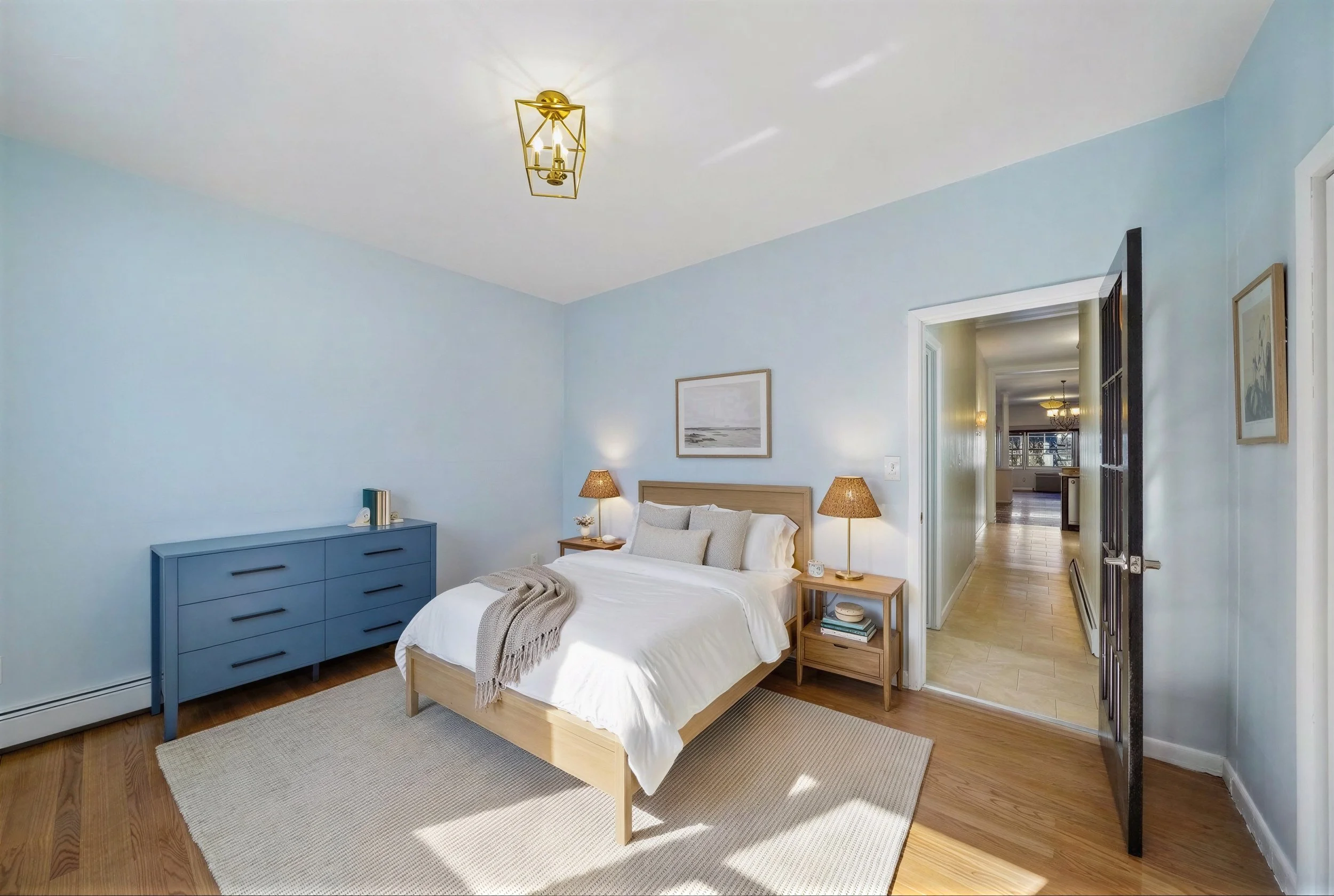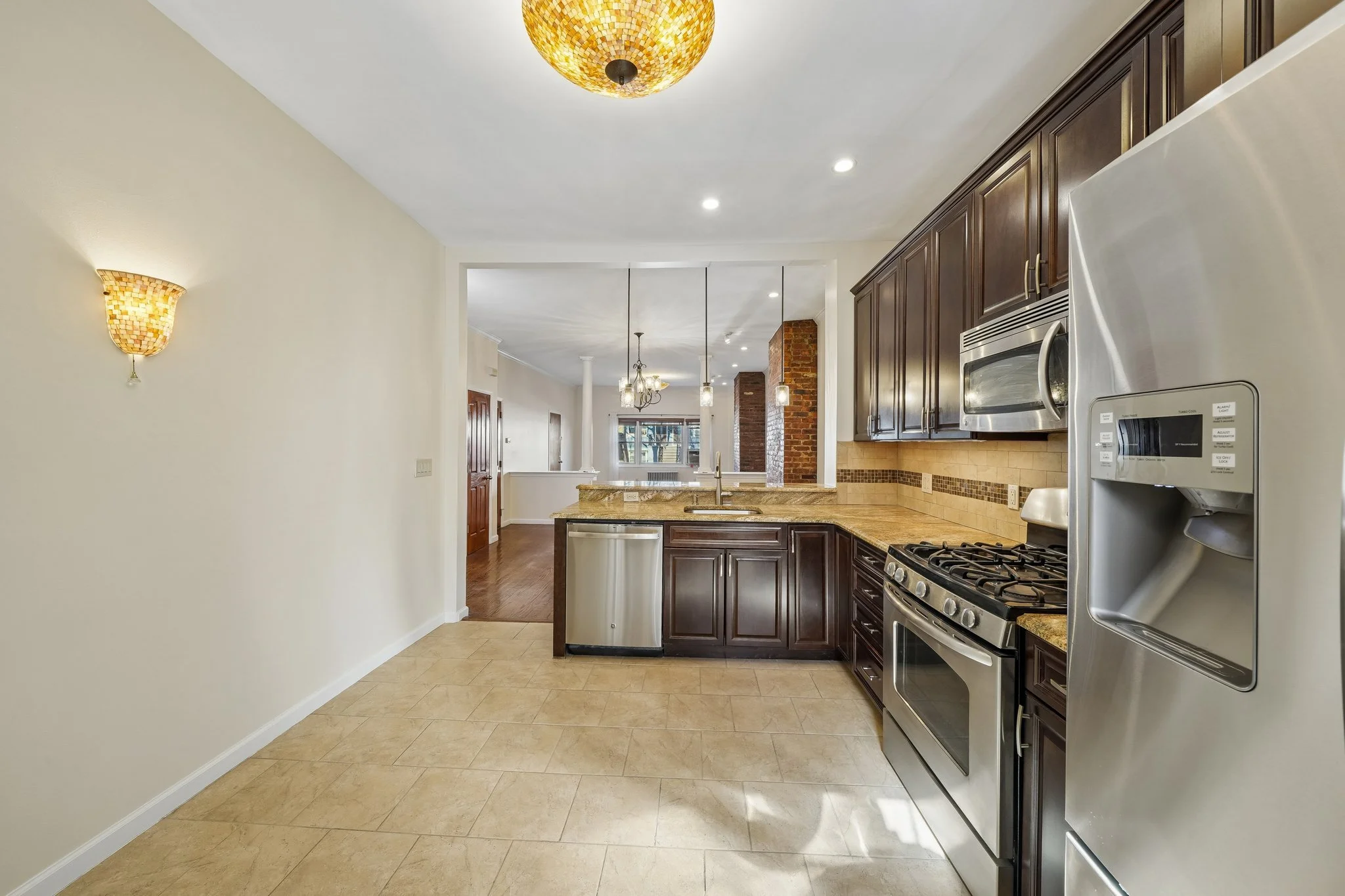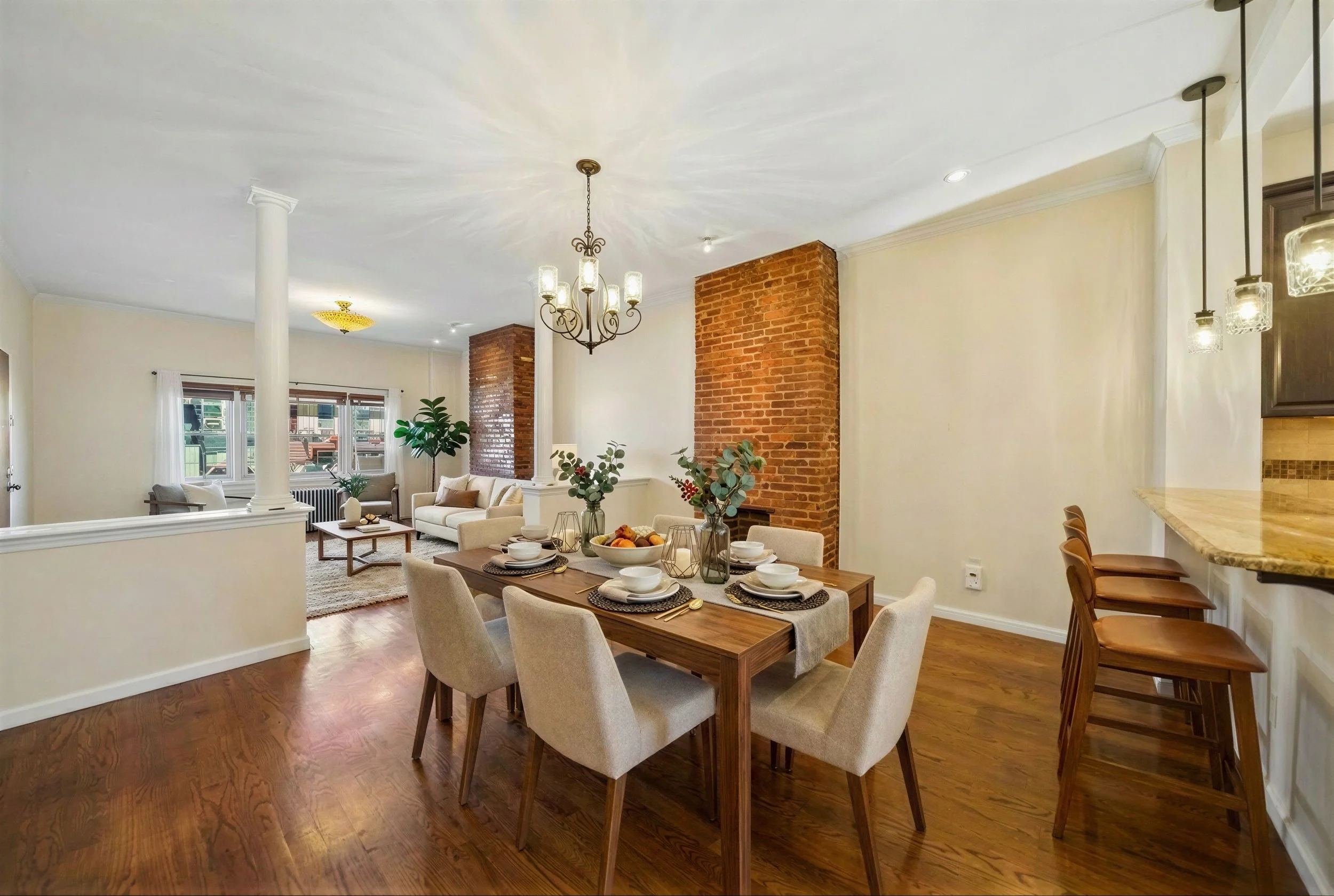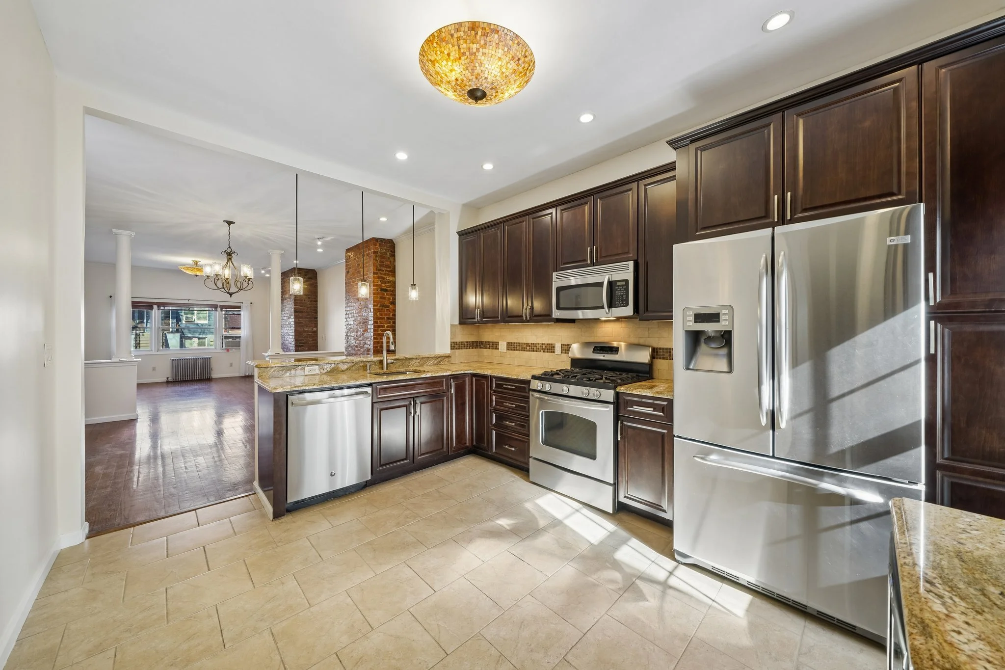 The apartment features a spacious open-concept layout with hardwood floors, freshly painted interiors, and abundant natural light throughout. The updated kitchen is designed for both everyday living and entertaining, complete with granite countertops, a breakfast bar, and newer appliances. A separate living room and dining area provide flexibility, while the generously sized bedrooms offer comfort and versatility.